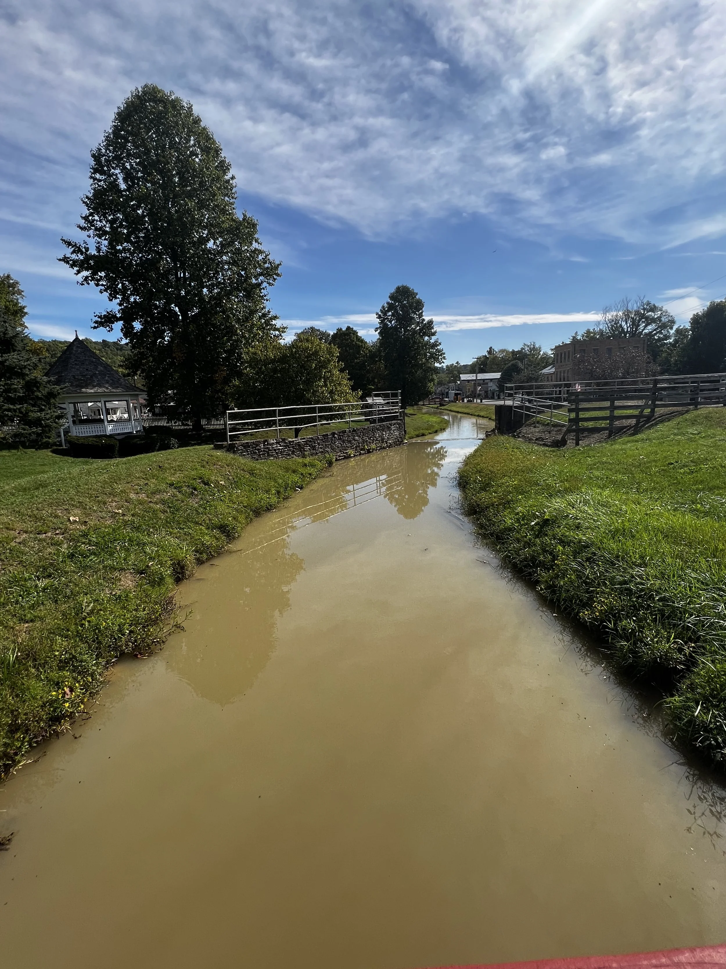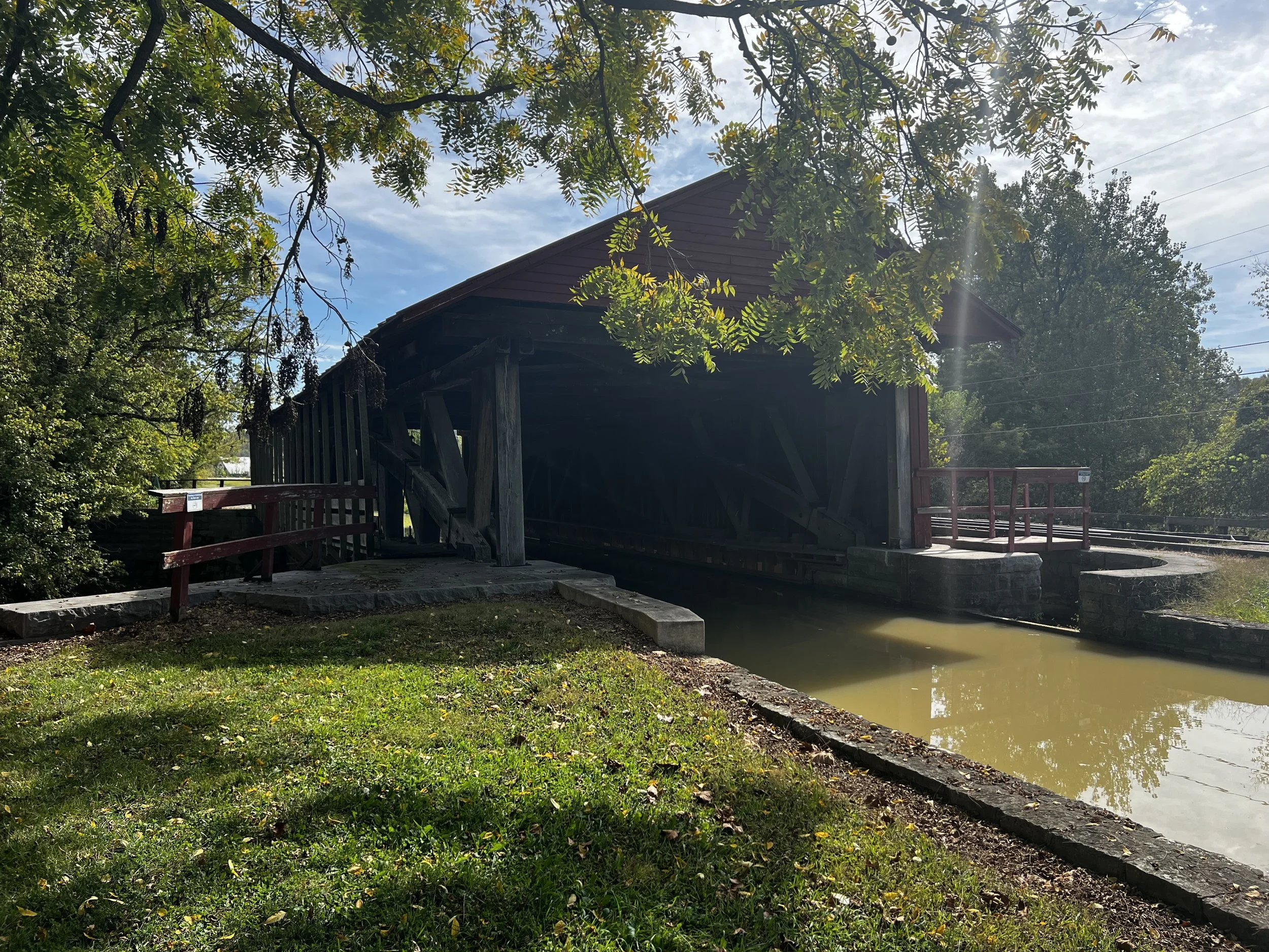 The aqueduct where the canal flows over a creek. looks like a covered bridge but water flows through it instead of a road.